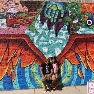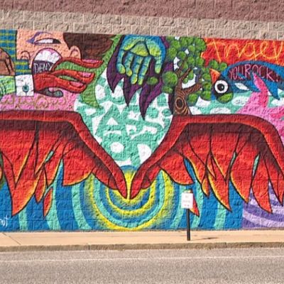 The colorful mural with bright red wings was spray painted on the side of Urban Chestnut’s location in The Grove.