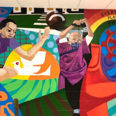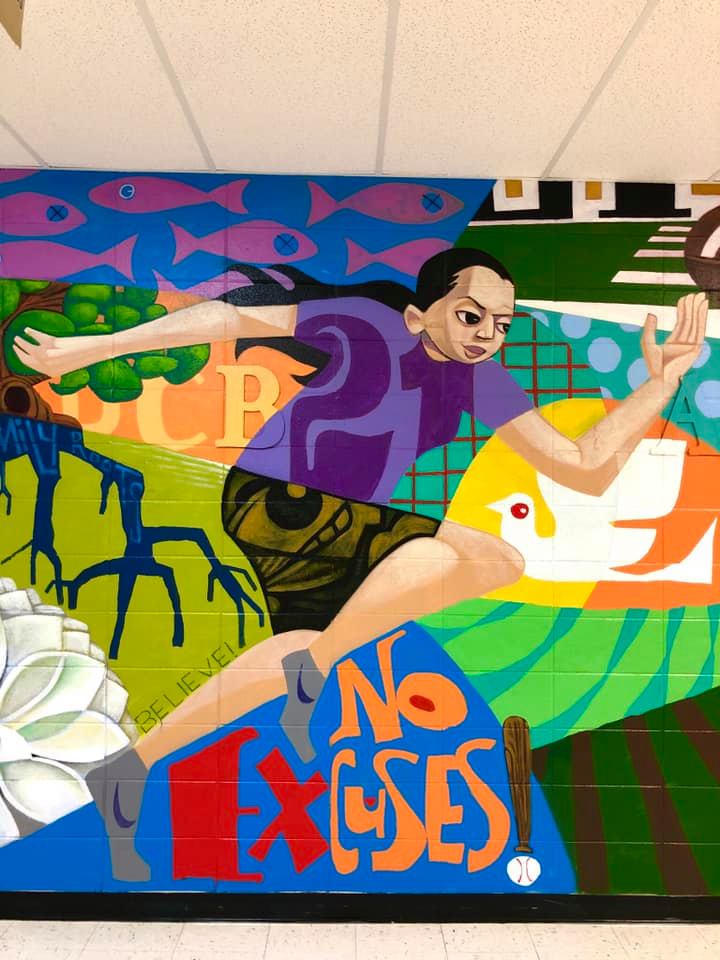 Bayoc is working on a wall-size painting at the high school “to empower kids and give them a sense of self,” art teacher Eric Adams said.